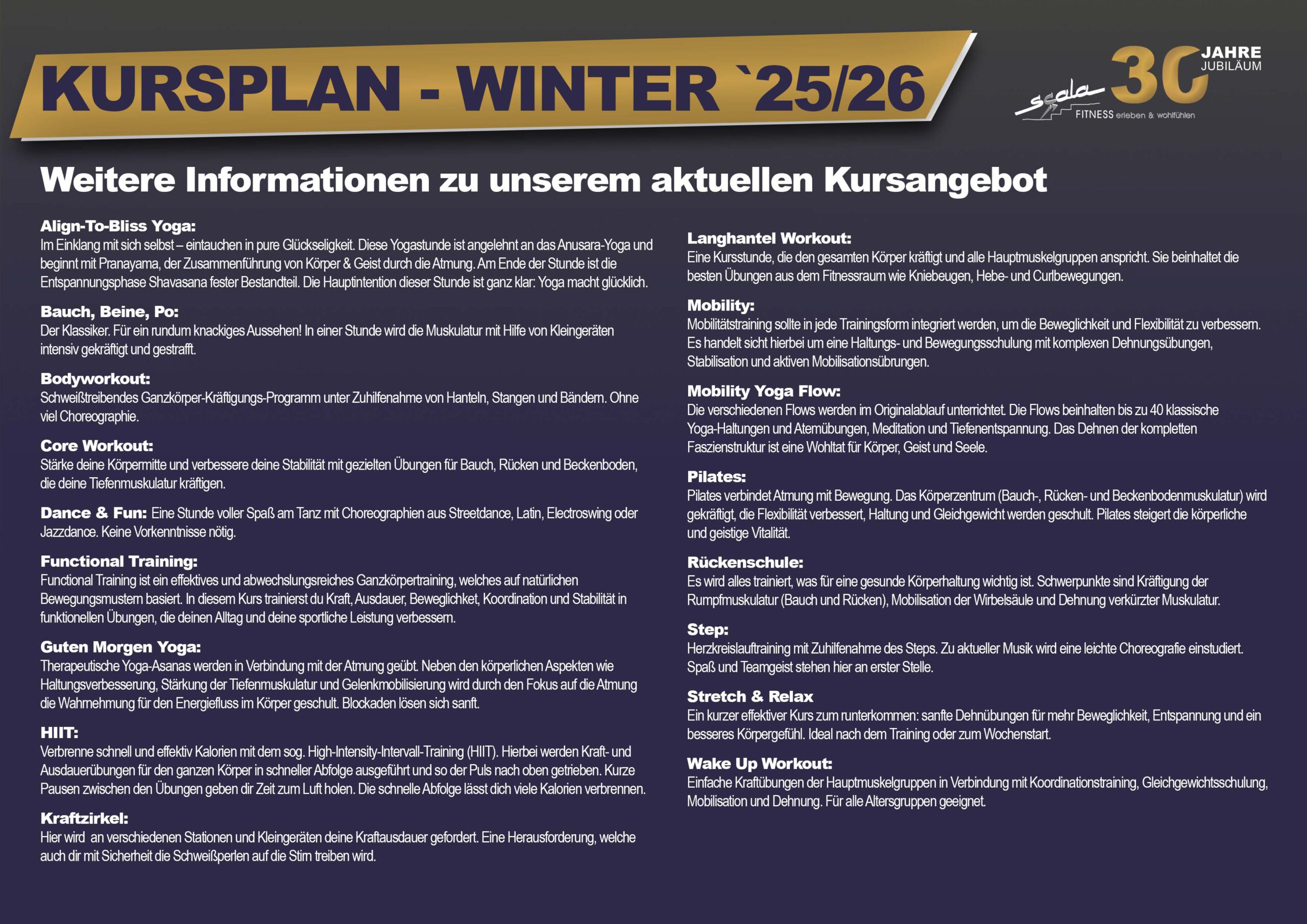 Unser Kursangebot reicht von gesundheitsorientierten - bis hin zu Power-Stunden. Ob z.B. gesunder Rücken, Step oder Yoga, bei uns findet jeder das Richtige. Mit viel Spaß an der Bewegung und bei motivierender Musik wird jede Stunde zu einem intensiven Erlebnis in einer Gruppe von Gleichgesinnten. Gerne beraten wir Sie bei der Auswahl Ihrer Kurse.